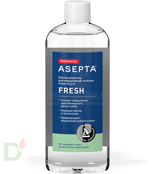 <h2>Эффективные зубные пасты, ополаскиватели и гели Асепта</h2> Здоровье зубов и десен во много зависит от качества ежедневной гигиены. Регулярное использование ПРАВИЛЬНЫХ средств поможет значительно снизить риски проблем полости рта. А это сохранит вам здоровье, нервы и бюджет (ведь лечение зубов - удовольствие очень дорогое!).<br> <br> <b>Средства Асепта эффективны при следующих проблемах полости рта:</b><br> <ul> <li>пародонтит</li> <li> гингивит</li> <li> стоматит</li> </ul> При использовании продуктов Асепта на постоянной основе вы гарантированно заметите значительное улучшение состояния полости рта!<br> <br> <b>Эффективность средств доказана клинически. Продукты обладают следующим эффектом</b><br> <ul> <li>снижают воспаления</li> <li> помогают бороться с кровоточивостью десен</li> <li> устраняют избыточный бактериальный рост в полости рта (причина развития кариеса, зубного налета и неприятного запаха)</li> <li> профилактируют развитие начальных и запущенных форм заболеваний полости рта</li> </ul> Используйте пасты и ополаскиватели Асепта дважды в день и со временем вы забудете о перечисленных проблемах. Их эффективность и безопасность подтверждена клиническими исследованиями в Центральном научно-исследовательском институте стоматологии и челюстно-лицевой хирургии<br> <br> <h3>Ополаскиватель полости рта для ежедневного применения</h3> Асепта Фреш - комплексный ополаскиватель для ежедневной гигиены полости рта. Обладает следующим действием:<br> <ul> <li>снижает повышенную чувствительность зубов</li> <li> защищает эмаль от воздействия кислот и бактерий</li> <li> предупреждает образование зубного налета и камня</li> <li> защищает от воспалений и кровоточивости</li> <li> замедляет бактериальный рост в полости рта</li> </ul> <b>Используйте ополаскиватель 2-3 раза в день после еды.</b><br>
